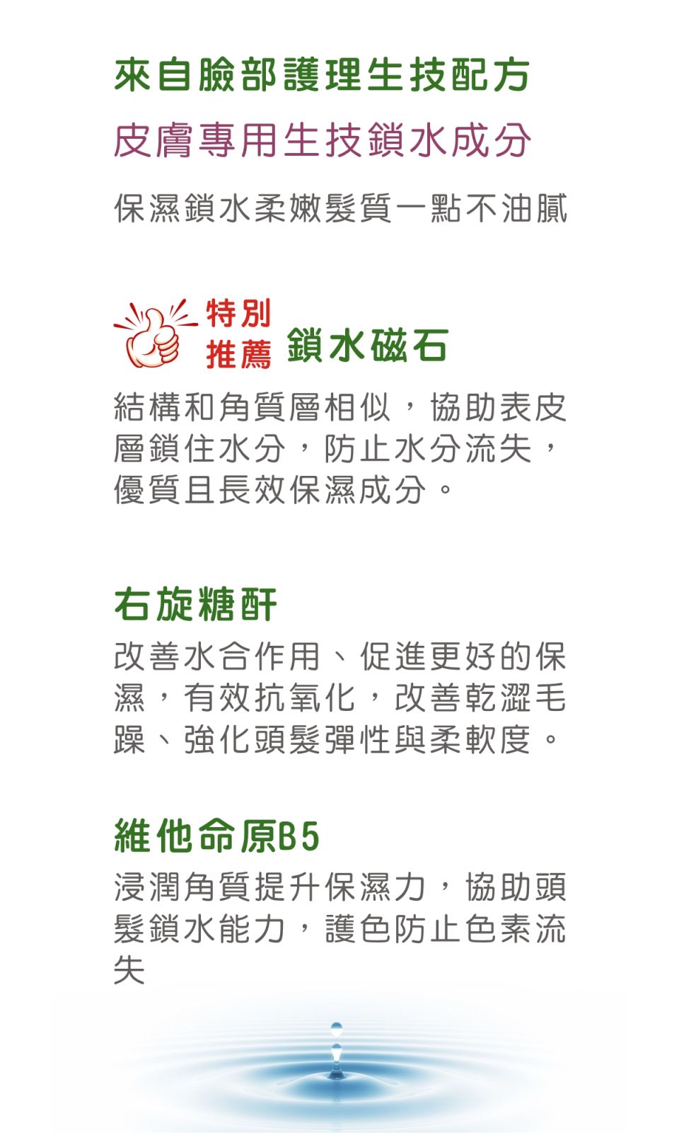 • ※  對待頭髮如同對待臉部,大量導入臉部護膚成分,呈現更細緻、更輕盈、蓬鬆的感受。