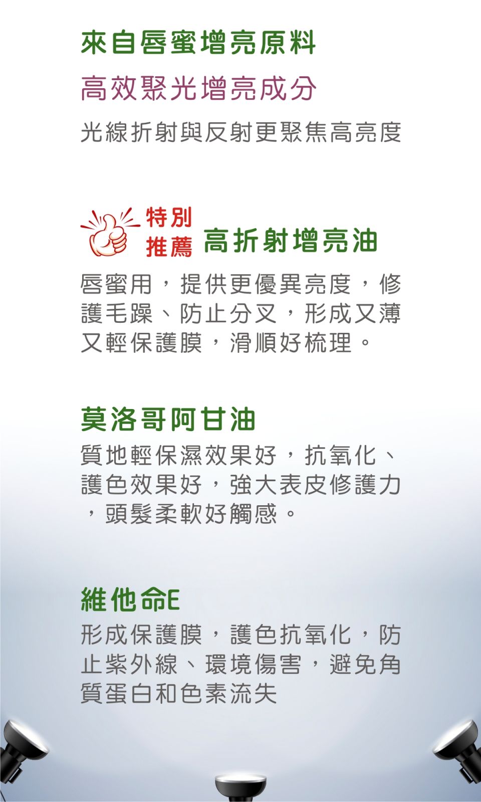 ※  特別為染髮怕黏膩感的人設計,台人普遍較受損,需要更多的光澤度,特別強化光澤呈現。