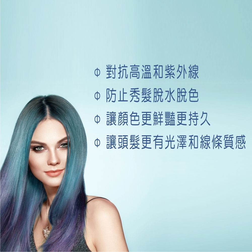 · 鎖水鎖色不吸水、乾爽不油膩:疏水性處方設計,保護膜讓頭髮和健康髮有相同的光澤卻無