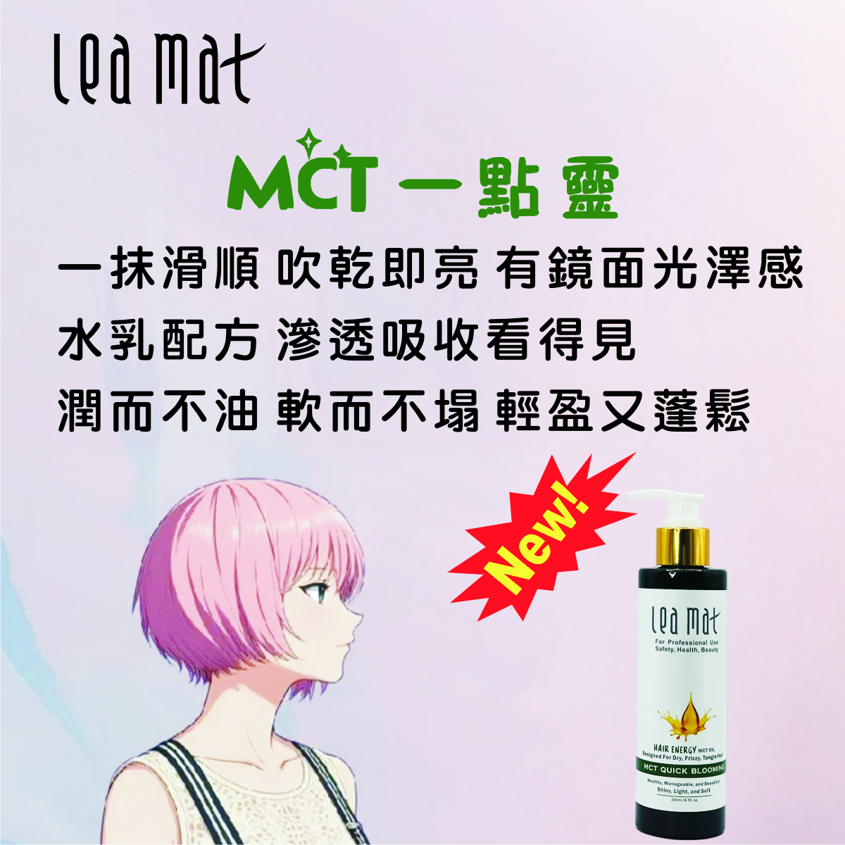 - 這次以【MCT一點靈】上市在即,這次以MCT油【 Medium Chain Triglyceride】為主角,免沖洗,滲透快,易吸收,亮度看得見....